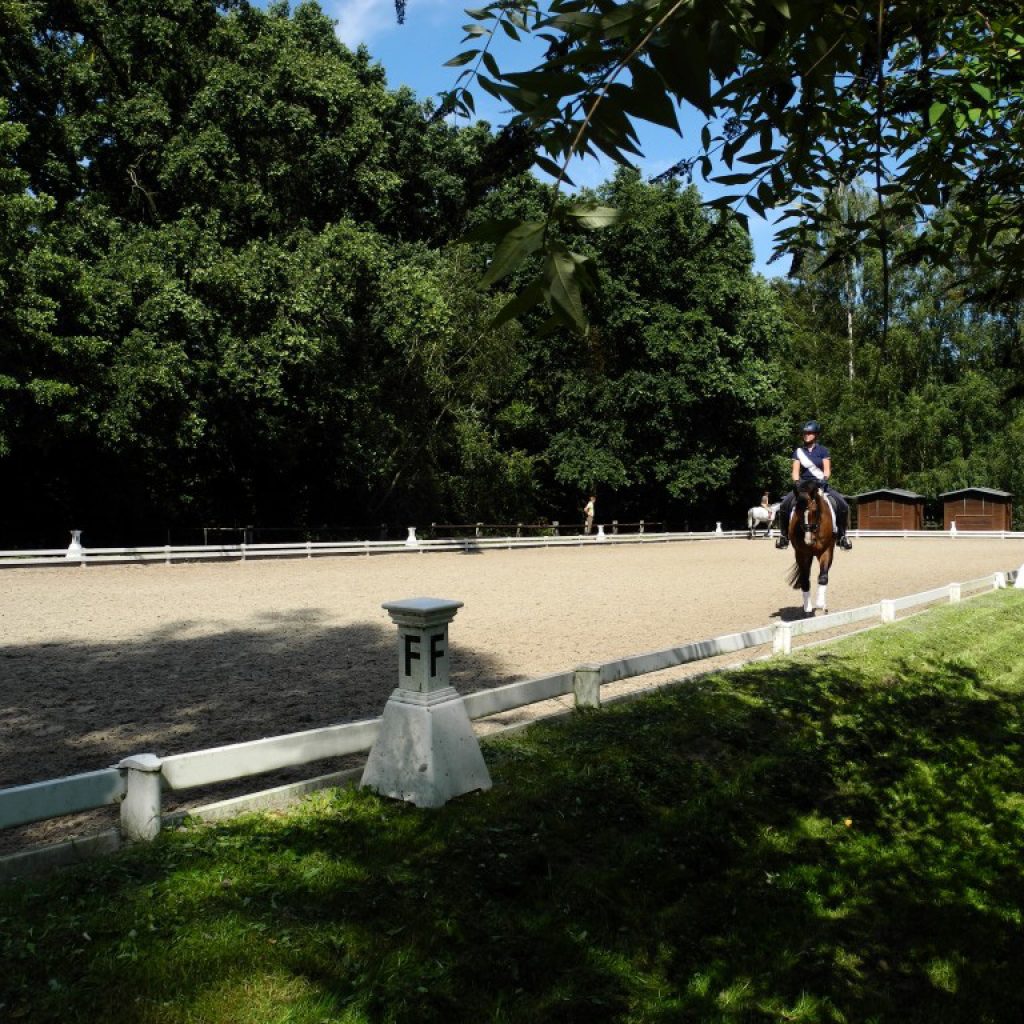 Das große 60-Meter-Außenviereck ist durch sein Ebbe-Flut-System ganzjährig bereitbar. Der spezielle Sandboden federt mit und ist besonders schonend für die Sehnen und Gelenke unserer Pferde. Der Platz liegt ruhig am Rande der Anlage und bietet nicht viel Ablenkung für die Pferde. Im Sommer spenden die begrenzenden Bäume Schatten und sorgen für eine angenehme Temperatur beim Training.